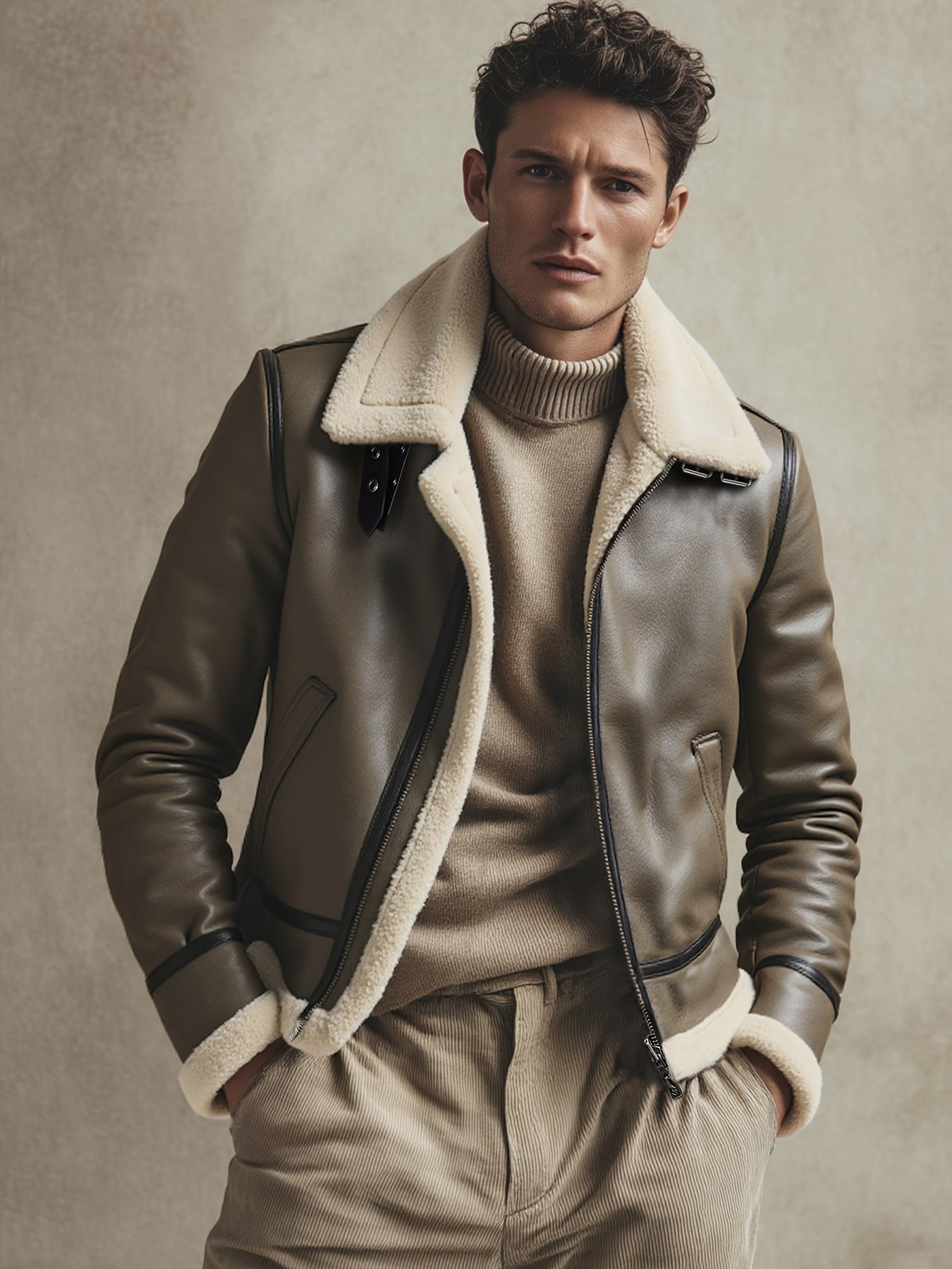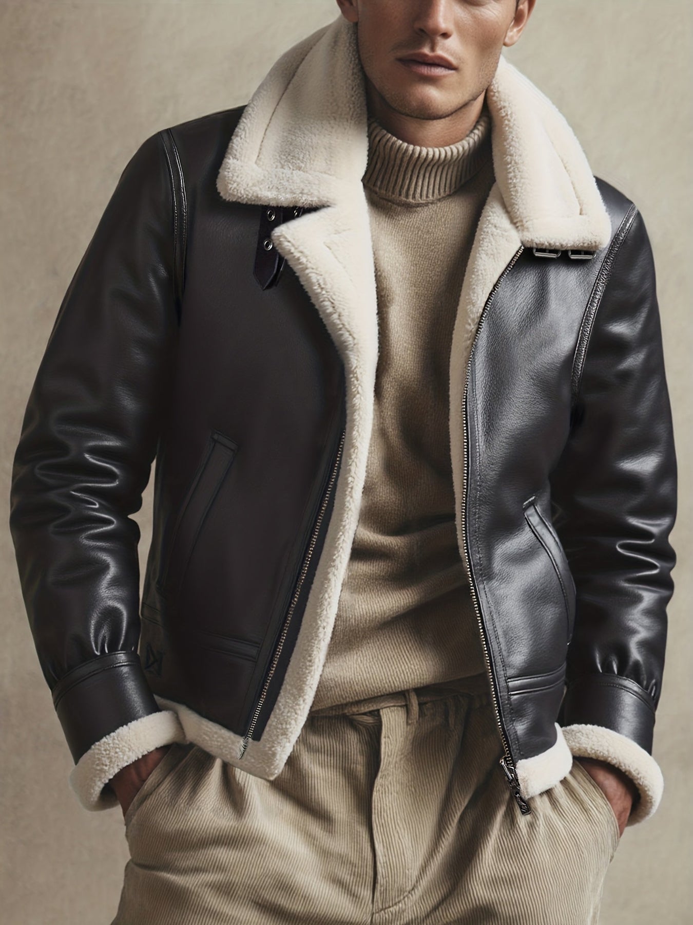 Style iconique – Esthétique pilote revisité, cuir marron profond et col contrastant pour une allure premium.